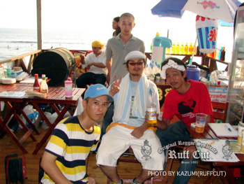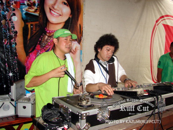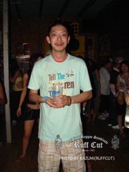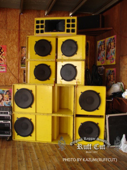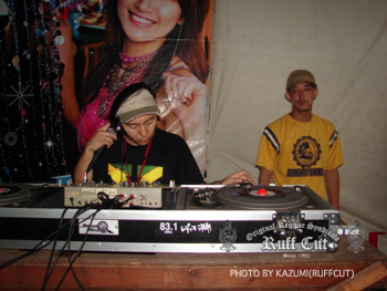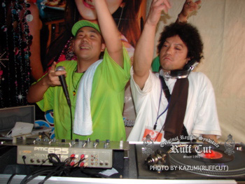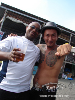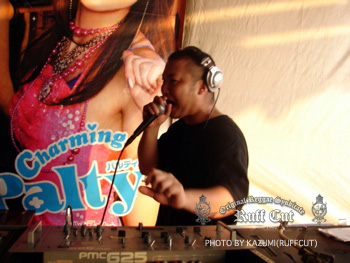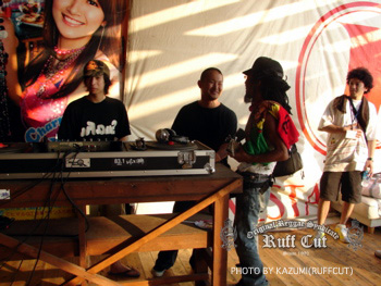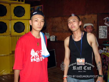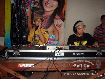 この日最初のプレイはレギュラーサウンドのC.H.SOUND。オジキラーと話をしているのはビデオマンのRUFF-CUT HIRO。 |